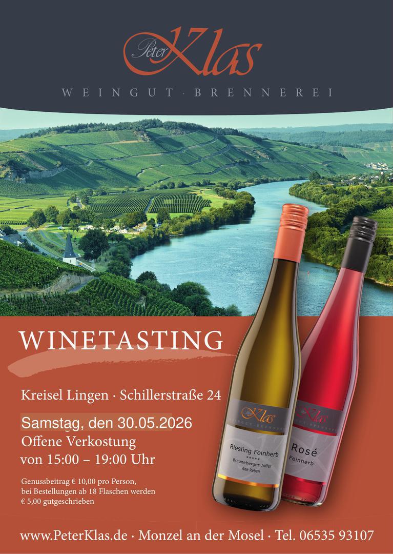 Am Samstag, den 30. Mai 2026, laden wir dich herzlich zur offenen Weinverkostung in Lingen (Kreisel, Schillerstraße